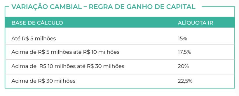 A isenção da variação cambial, atualmente em vigor, permanece até 31.12.2023. A partir de 01.01.2024, a isenção será revogada e a variação cambial passará a ser tributada conforme a regra geral de tributação de ganho de capital acima.