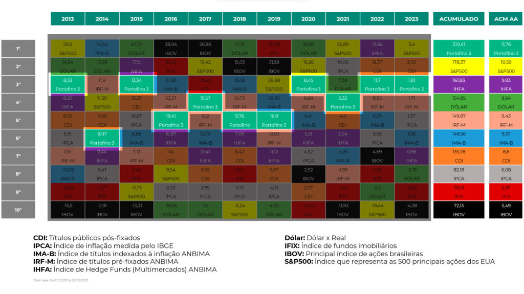 Veja na imagem abaixo como um dos nossos perfis (Perfil 3 – Moderado) mantém um resultado médio constante, enquanto os demais ativos ano a ano sofrem com as mudanças de cenário.