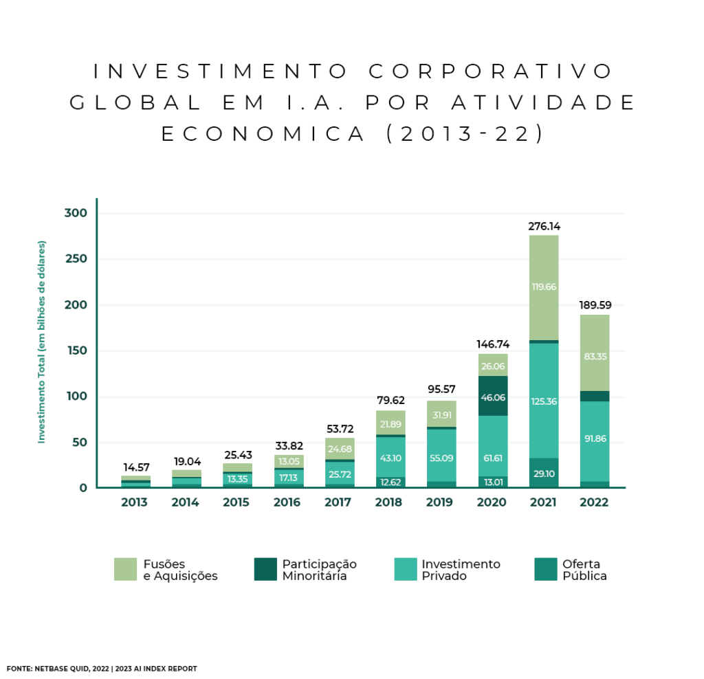 Segundo o Artificial Intelligence Index Report 2023, a proporção de empresas adotando IA em 2022 mais do que dobrou desde 2017. Neste sentido, os EUA lideram o mundo em termos totais de quantidade de investimento privado na área. Em 2022, os US$ 47,4 bilhões investidos nos EUA foram aproximadamente 3,5 vezes o valor investido no segundo maior país, a China (US$ 13,4 bilhões). Os americanos também continuam a liderar em termos do número total de empresas de IA recém-financiadas, vendo 1,9 vezes mais do que a União Europeia e o Reino Unido juntos, e 3,4 vezes mais que a China.