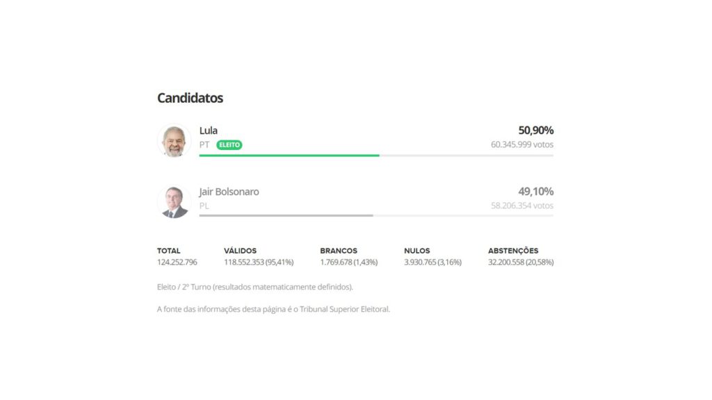 O petista chegou ao segundo turno como o favorito a assumir o Executivo, após vencer o primeiro turno. Mais apertada do que as pesquisas previam, a diferença entre os dois candidatos foi a menor entre todas as corridas presidenciais da nossa história e manteve a escrita de que nunca um candidato que chegou ao segundo turno na segunda posição, conseguiu reverter o resultado. Apesar de levantar certa apreensão devido à Bolsonaro se manter em silêncio desde a formalização de sua derrota nas urnas (até o momento desta edição 17h50 de 31.10.2022), aliados do presidente, como a senadora Damares Alves (Republicanos), o senador Sérgio Moro (União Brasil), a deputada Carla Zambelli (PL-SP) e o governador de MG Romeu Zema (Novo), já se manifestaram reconhecendo a vitória de Lula, reduzindo o temor de uma contestação dos resultados. O que se viu, no entanto, foram bloqueios nas estradas no Brasil realizados por caminhoneiros bolsonaristas contrários ao resultado das urnas.